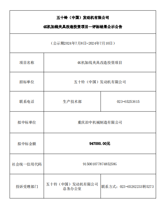 下一篇五十铃(中国)发动机有限公司 中标结果公示